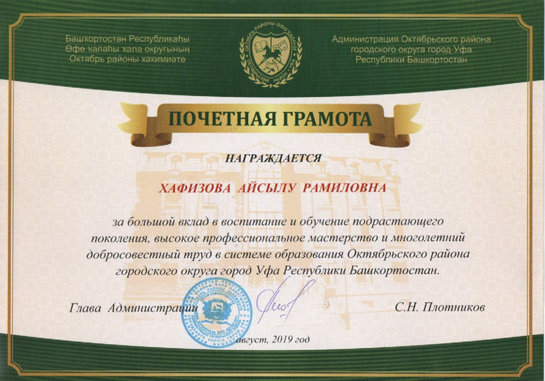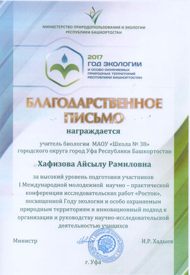 Победитель в номинации "Юный исследователь" в конкурсе исследовательских работ в рамках республиканской экологической недели, посвященной проблемам водных ресурсов "Живая вода Башкортостана"